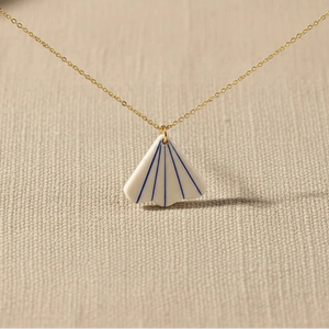 This abstract petal pendant necklace is both fresh and classic at the same time. The porcelain pendant is ¾” tall x ⅞” wide and was kiln-fired by Jenna Vanden Brink Ceramics in Pittsburgh, Pennsylvania — the Paris of Appalachia. Its chain in 18" long and 14K gold-filled with a spring ring clasp.Because each pendant is handmade, their shapes, sizes and patterns can vary ever so slightly from what's pictured here.